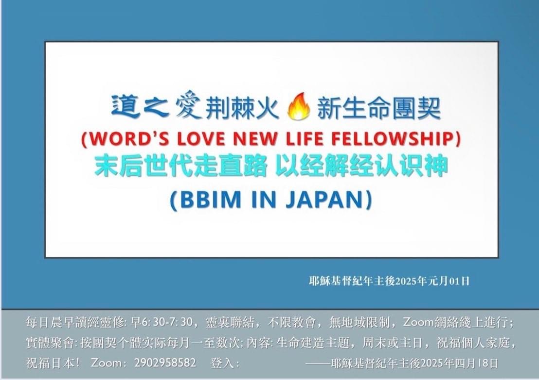 時光飛逝,世上歲月的足迹已踏進耶穌基督紀年主後 2025 年七月下半年的日子!這是一封寫給當下末後世代經歷重生後,仍用心順從主,篤信真理之道,渴慕神大有能力的話語(路1:37),定睛耶穌,不願再偏行己路,定意順從聖靈光照,謙卑降服主,持守在祂裏面的心志,更願被聖靈的能力覆庇,在地上寄居的日子願如鹿渴慕溪水一般,藉著每早晨讀經靈修親近神,幷常以禱告與神靈裏交通,願意擺上,經歷被主更新再造、模塑成爲新的生命,以此預備等候坐寶座很快就要再來的主!在此前更願以誠實行動回應復活生命之主基督的大使命,順服在祂裏面成聖旅程的指引和帶領,在“末後世代走直路、以經解經認識神”這源自于神本體自我啓示祂子民認識祂(出3:14)幷祂兩千年前道成肉身從天降臨親自演繹指引我們認識神(約17:3)的异象聖工,凡願學習幷參與其中,在清楚領受本异象爲主僕、作牧人的引導下,一同經歷體驗神人摩西曾經歷的“看見、知道、思想、明白”(賽41:20),以致得以認知“耶穌就是耶和華”(新舊約屬靈本體一致),在如此一位永恒不變、守約施慈愛的神始終同在帶領的生命團契中,彼此聯結,不僅在晨早讀經中共同領悟神話語的光照,也必在末後世代奔走主已指明成聖道路的日子裏,彼此靈裏相交,在合乎神旨意的异象中模塑新生命,同負宣教大使命在日本的聖工!——本書函致意所有清楚明白幷願意領受這一异象的主內肢體,即願意加入本BBIM晨早讀經靈修群組的弟兄姐妹,在我們已經走過主所帶領如此道路達一整年又逾兩個多月的今天,若您有從主而來的看見幷聖靈的感動,願意成爲這個以 “基督之愛”爲源頭、“末後世代走直路、以經解經認識神”爲路徑和异象之“道之愛荊棘火新生命團契”的一員,这幷不会受您原參與聚會的教會以及地理環境位置的限制,只要您認同這异象,領受這是從神而來、合神旨意的异象,願意參與其中,歡迎您加入我們,與我們一起,在這末後世代與神同行,奔走天路,預備充足的燈油,遵行主大使命的呼召,珍惜生命,积极投入在这末后世代的宣教使命中,隨時预备迎接主的再來!哈利路亞,以馬內利!